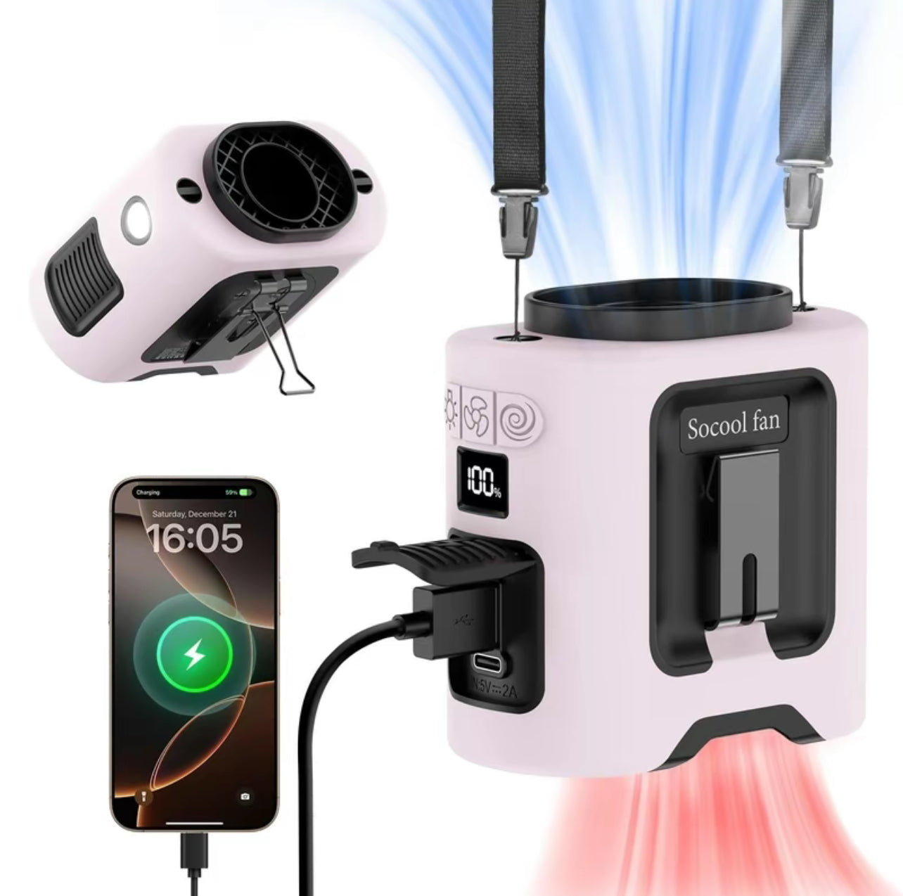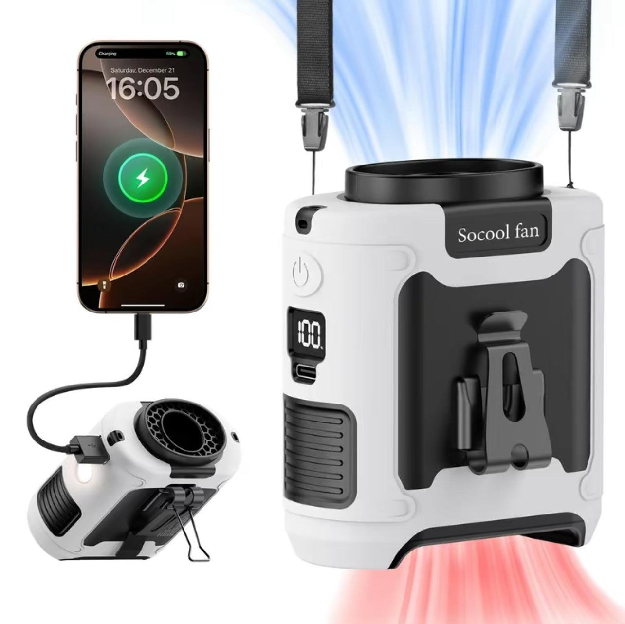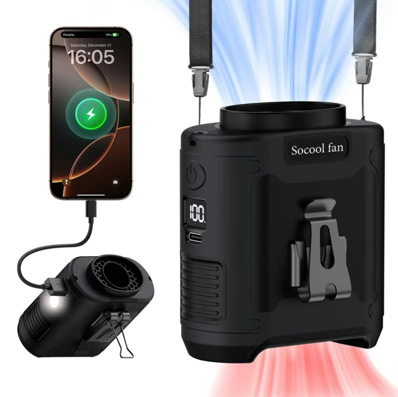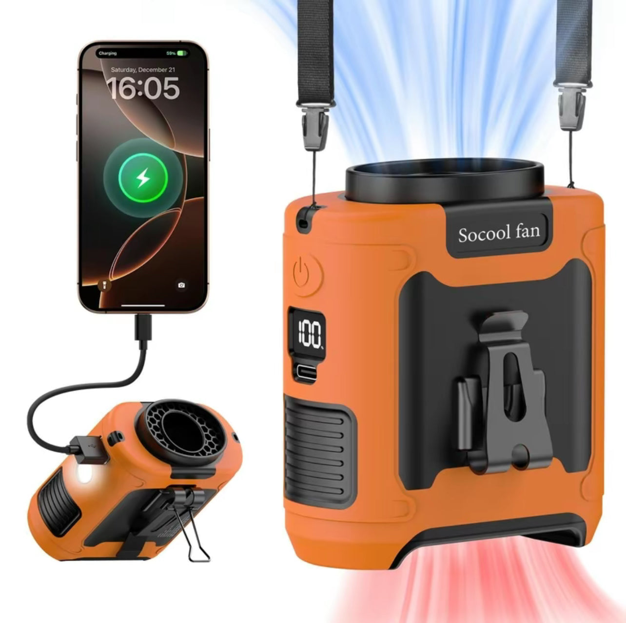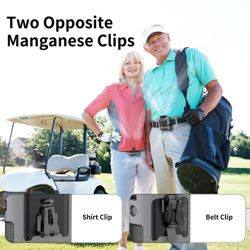 【Long Lasting Working Time】Built-in 10000mAh rechargeable battery, which can be run continuously for up to 40 hours at low speed according to the air speed and light mode, and takes 4-5 hours to to fully charge. This portable waist clip fan can be used when it's during charging. Built-in 5V-3A type C input and 5V-2A USB output, Which is convenient for charging the cordless fan, and it provides long-lasting cooling wherever you need it.【5 Levels of Powerful Wind Adjust】This Electric USB fan has a high-speed brushless motor with a maximum speed of up to 16000RPM and blows at most 18mf/s strong airflow, cooling down in a second. With 5 gears and adjustable wind speeds from natural to strong, it can be set to various modes according to your needs when you are using it. The maximum wind speed persists for 8 hours, whereas the minimum wind speed can endure for as long as 40 hours. It is an ideal choice for workers who need the strong wind in high-temperature environments.【5 in 1 Multifunctional Waist Clip Fan】An integrated waist clip fan, desk table fan, and neck fan. You can clip this belt fan to your shirts, belt, or pants, or you can hang the personal fan around your neck with the lanyard. With a bracket on the fan clip, you can put this USB fan on the desk. It can be used as an emergency power bank to directly charge a mobile phone, with no more fear of running out of phone battery. Built-in LED Light and SOS function, it not only provides long-term illumination but also helps you with outdoor activities.【With Silicone Cover, Non-Slip and Anti-Drop】Our mini portable waist fan is designed for various outdoor usage scenarios, catering to occupations like workers and farmers. It comes with a high-quality protective silicone leather case which protects from shock when dropped and ensures the body fan is not damaged at all. The upgraded Manganese steel clamp provides stronger gripping force, always keeping the wearable fan firmly, and is more durable. Practical design with two clips facing opposite directions allows for more placement options.【With Bottom Air Intake】Unlike other fans where the intake is on the side, our waist fan with bottom air intake, with the straight-through airflow design blows a strong airflow without any obstruction. And it is not easy to block the intake vent with your shirt even clipping under the shirt.【Flexible Charging and Compact Size】This undershirt fan has fast charging support via USB chargers, laptops, computers, car chargers, and other USB-enabled devices, it is the perfect choice for home, office, desktop, travel, outdoor, car, and camping. Due to the compact size of this cooling fan which is only 290 grams, you can take this small fan anywhere you want. Not only can it be used indoors home office, but it can also bring a cool feeling to your outdoor activities, like courtyard working, fishing, hiking, camping, and travelling.
